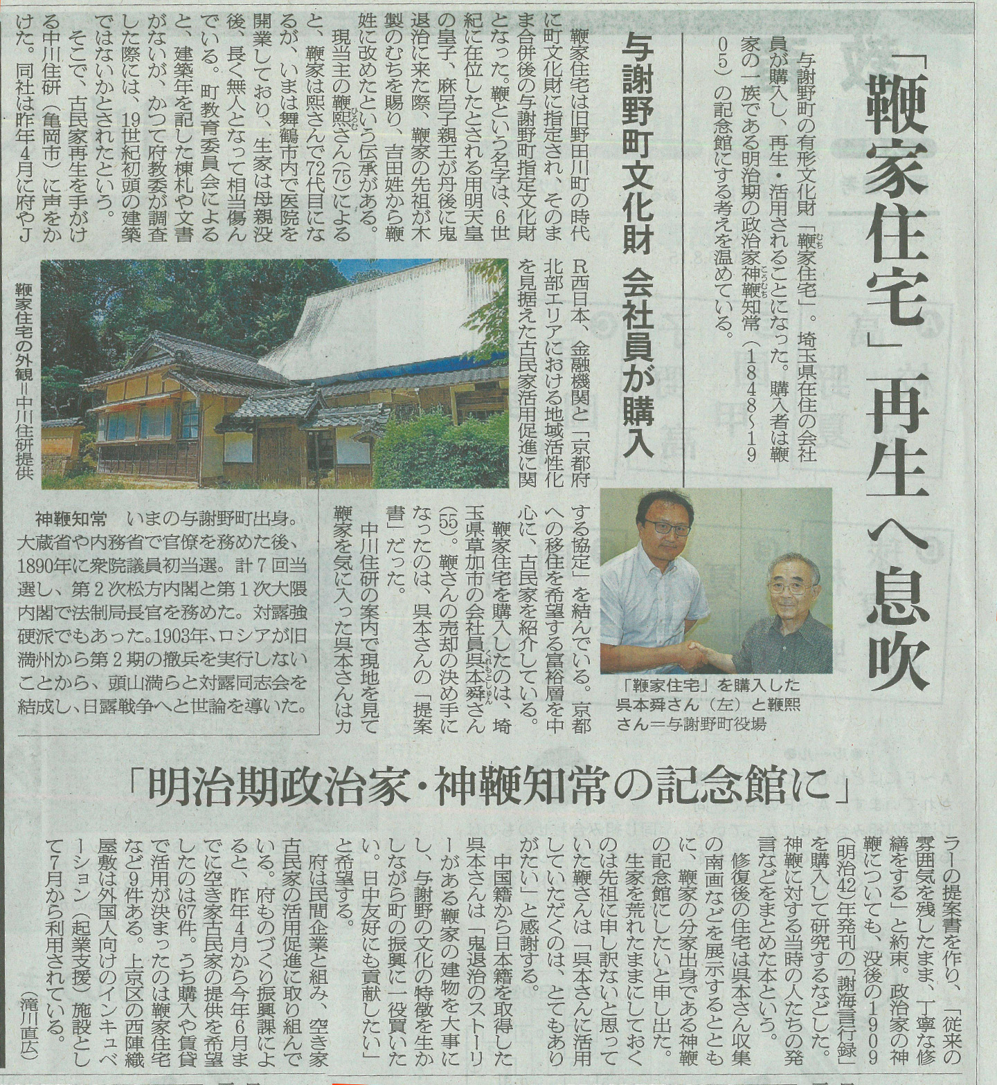 「京都府古民家バトンタッチ応援事業」に空家の相談を頂いた与謝野町有形文化財の「鞭家住宅」。この度事業を通じて埼玉県のお客様に購入頂き、歴史ある古民家が記念館として再生、次世代へ継承される事になり、朝日新聞に掲載頂きました。