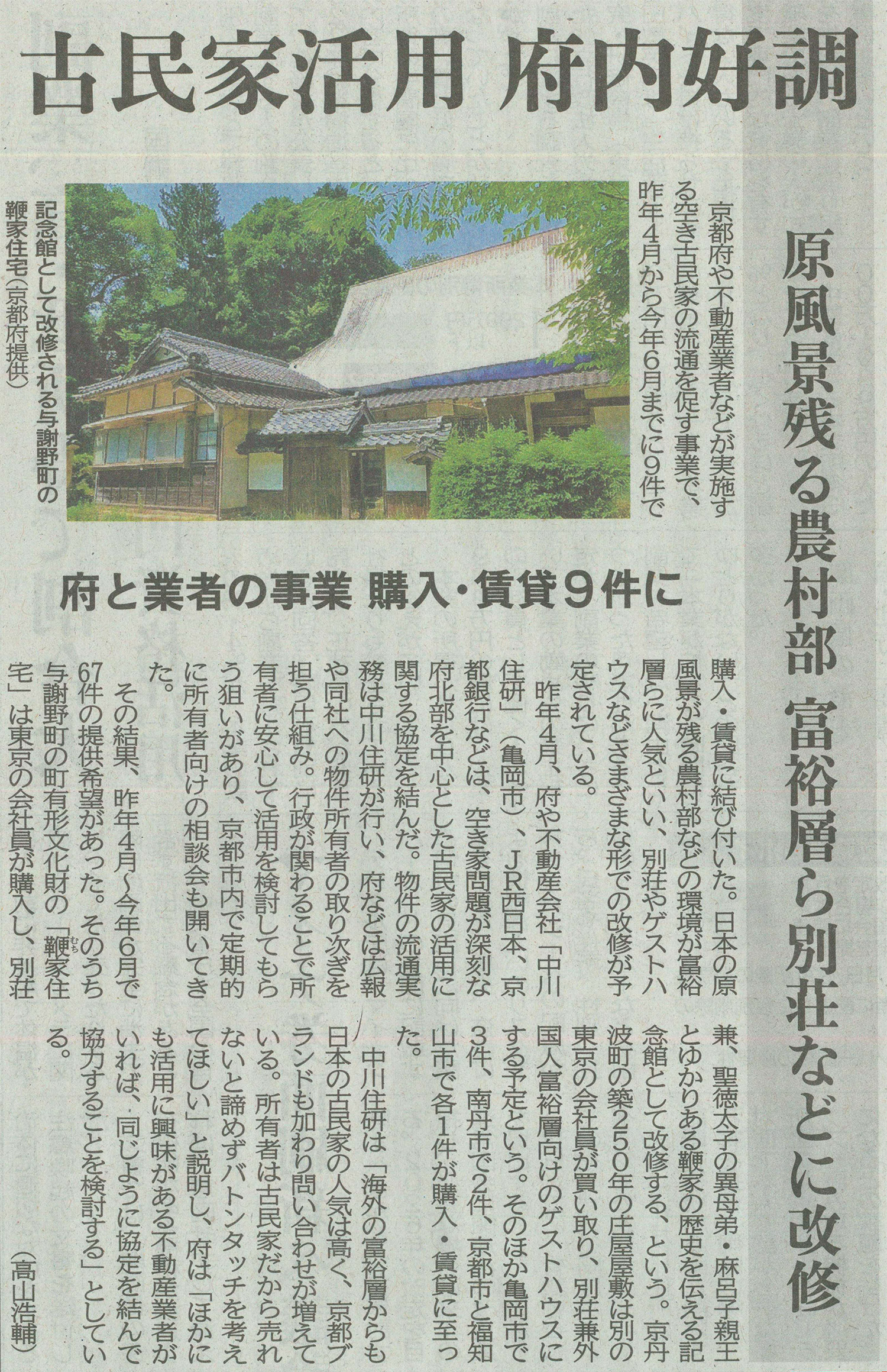 京都府と連携し取り組んでいる、空古民家の流通を促す「京都府古民家バトンタッチ応援事業」において、富裕層からの需要や別荘等の事業活用が活発化している事を、京都新聞に掲載頂きました。